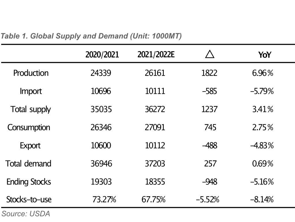 In the 2021/2022, the total output is expected to increase substantially by 6.96%, which means that this year’s harvest is good and the supply is strong. In terms of global consumption, it is also expected to increase by 2.75%. However, we should notice that the import and export have all dropped sharply. Global imports decreased by 5.79%, while exports decreased by 4.83%. This means they are produced for their own consumption, and no longer import or export.