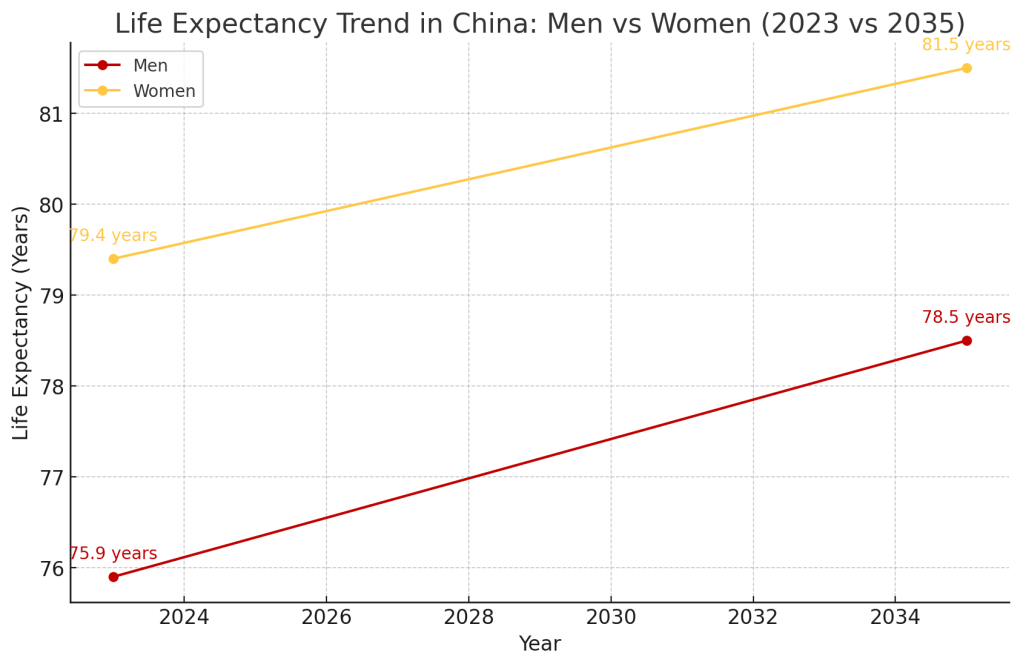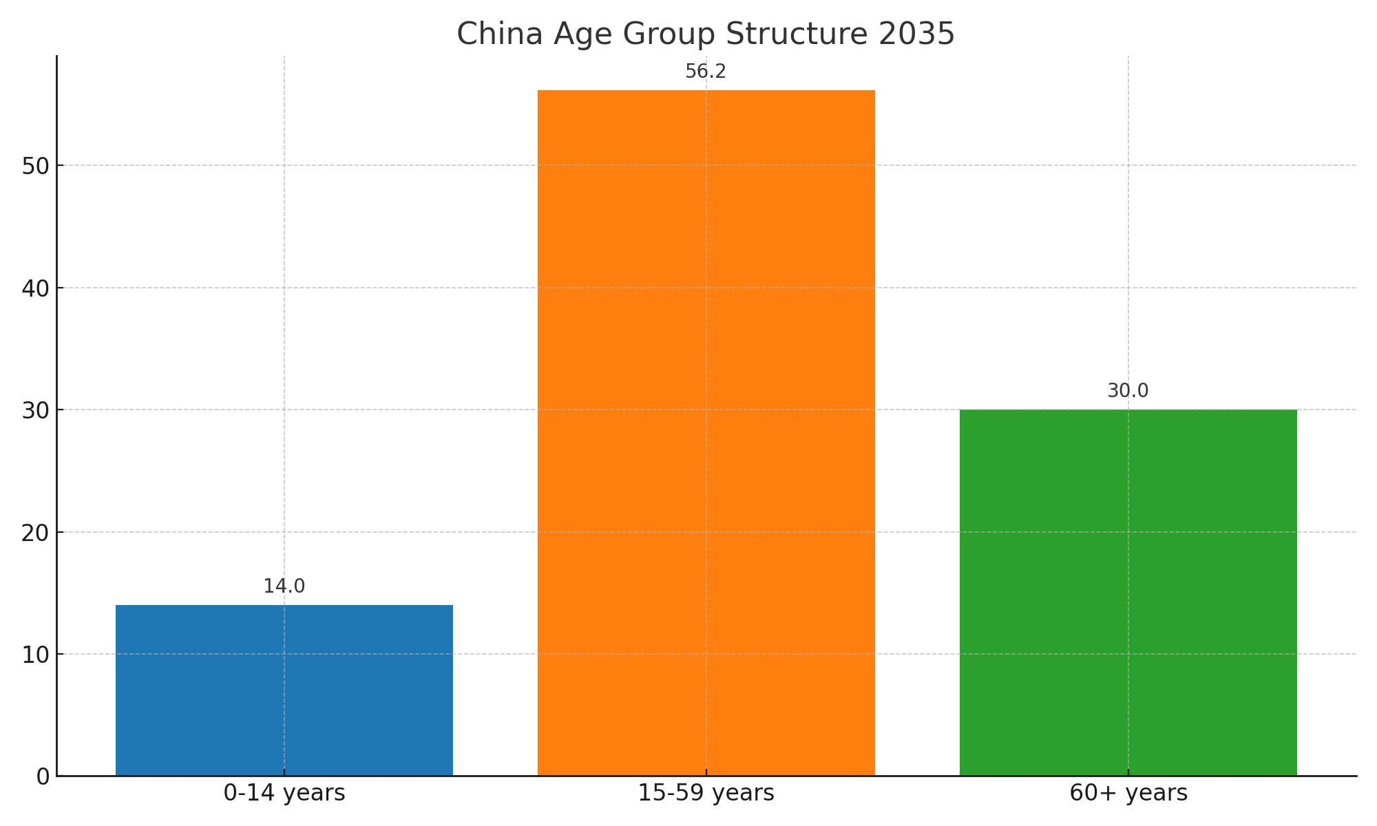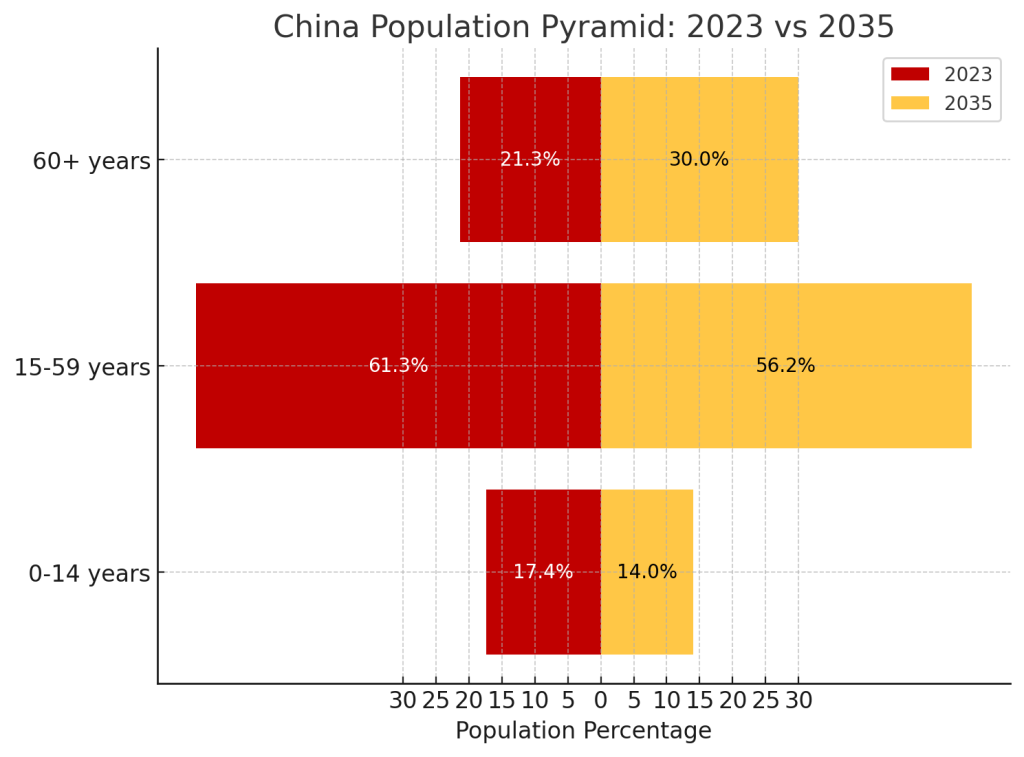 Aging Population: By the end of 2023, nearly 300 million people in China were aged 60 and older, accounting for around 19.8% of the total population. This number is expected to grow further, with projections suggesting that by 2035, around 400 million people will be over 60 years old.
