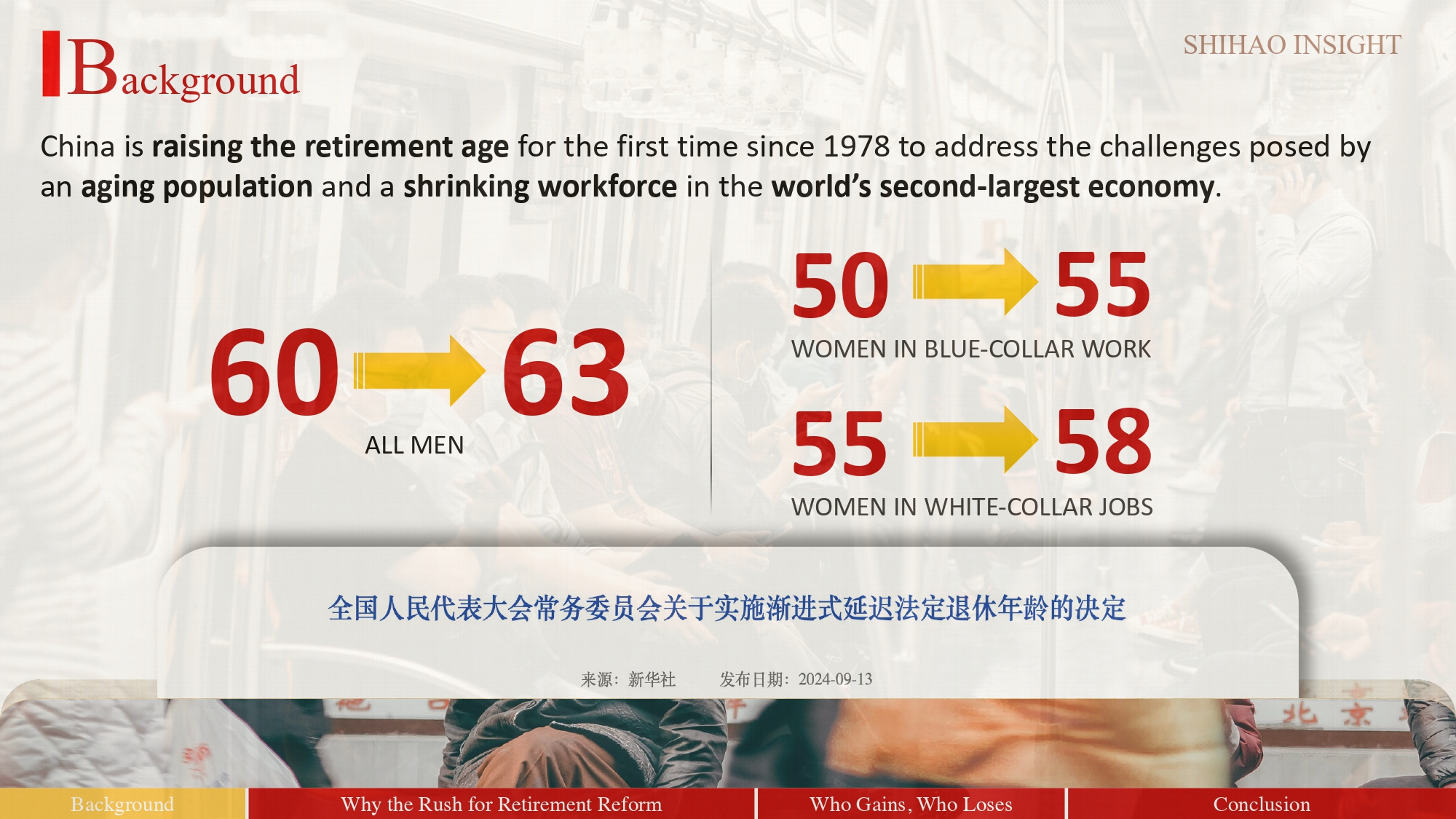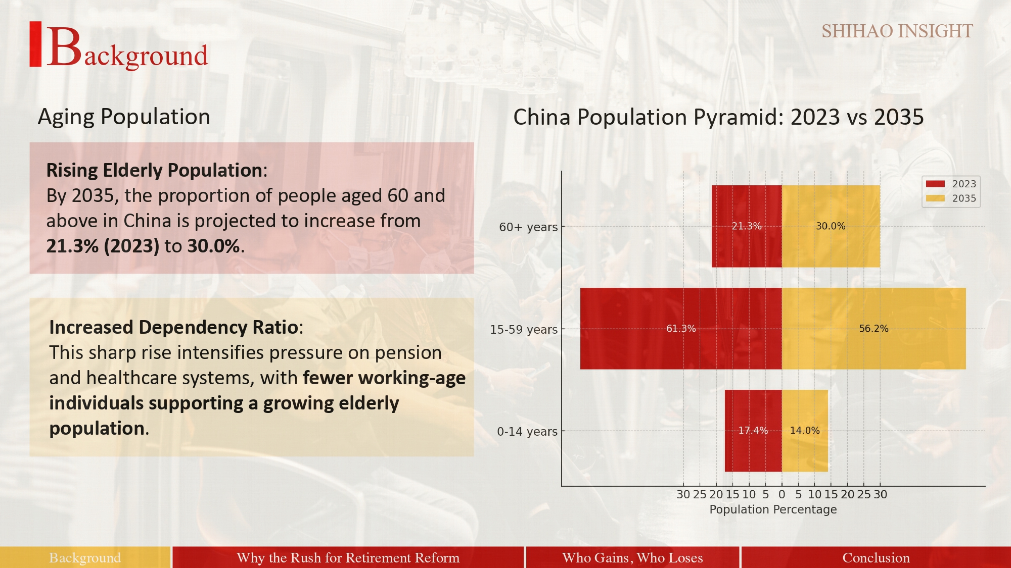 These demographic shifts are driving the government to reform its retirement policies to cope with the increasing strain on pension systems and the shrinking workforce.