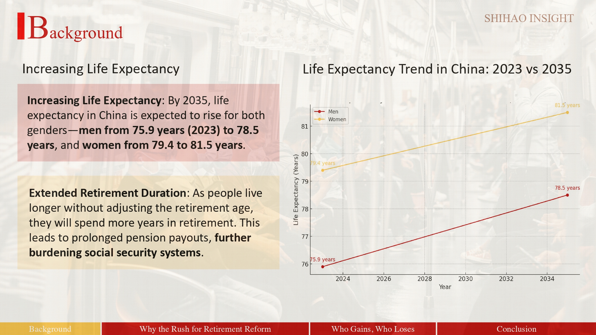 Rising Life Expectancy: Life expectancy in China has increased significantly, reaching 77.64 years in 2024. With people living longer, retirees require pension support for a longer period, further straining the system.