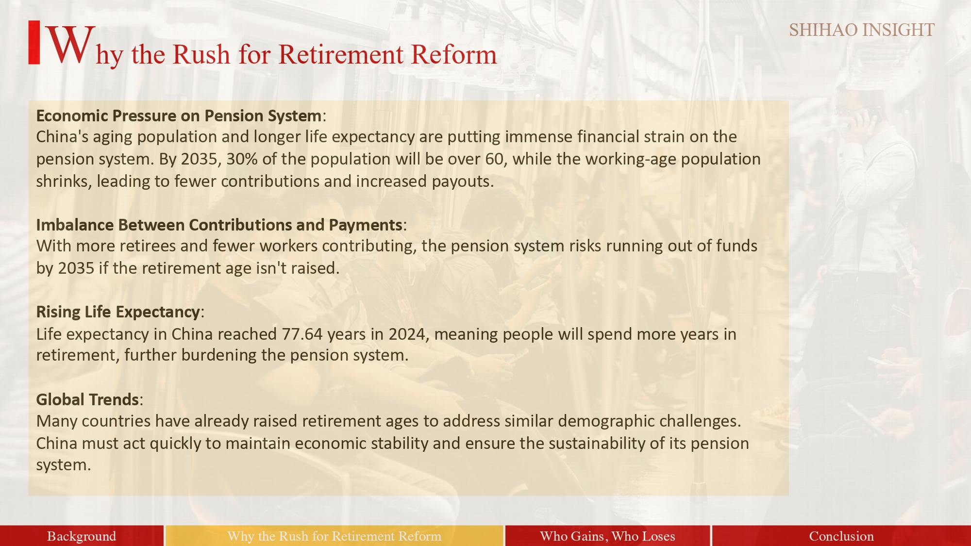 Global Trends: Many other countries facing similar aging challenges have already raised retirement ages to alleviate pressure on their pension systems. China must follow this trend to ensure economic stability and maintain the viability of its pension system.