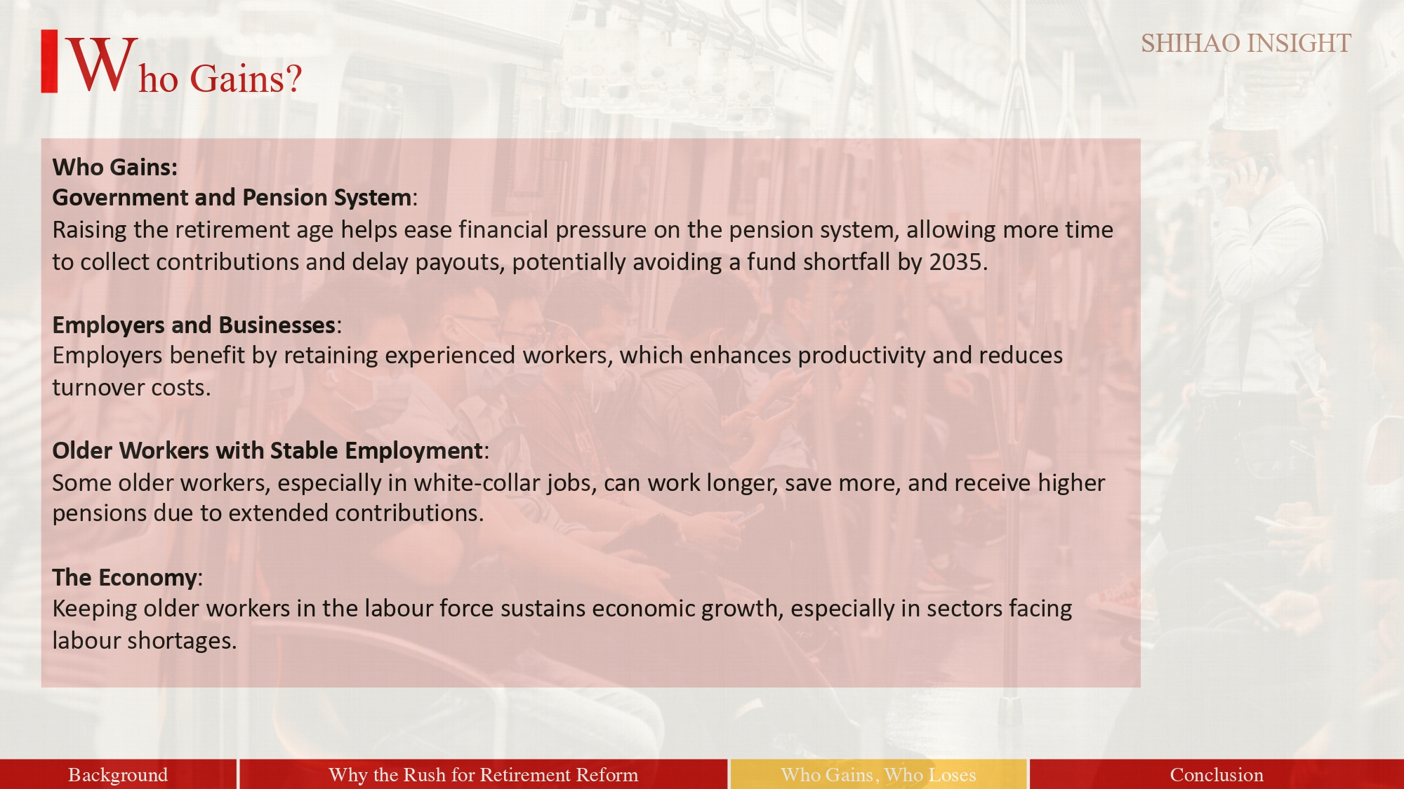 Some older workers, especially those in white-collar jobs, may benefit from the opportunity to work longer and continue earning an income. This could allow them to save more for retirement and benefit from delayed pension payouts, which might be higher due to extended contributions.