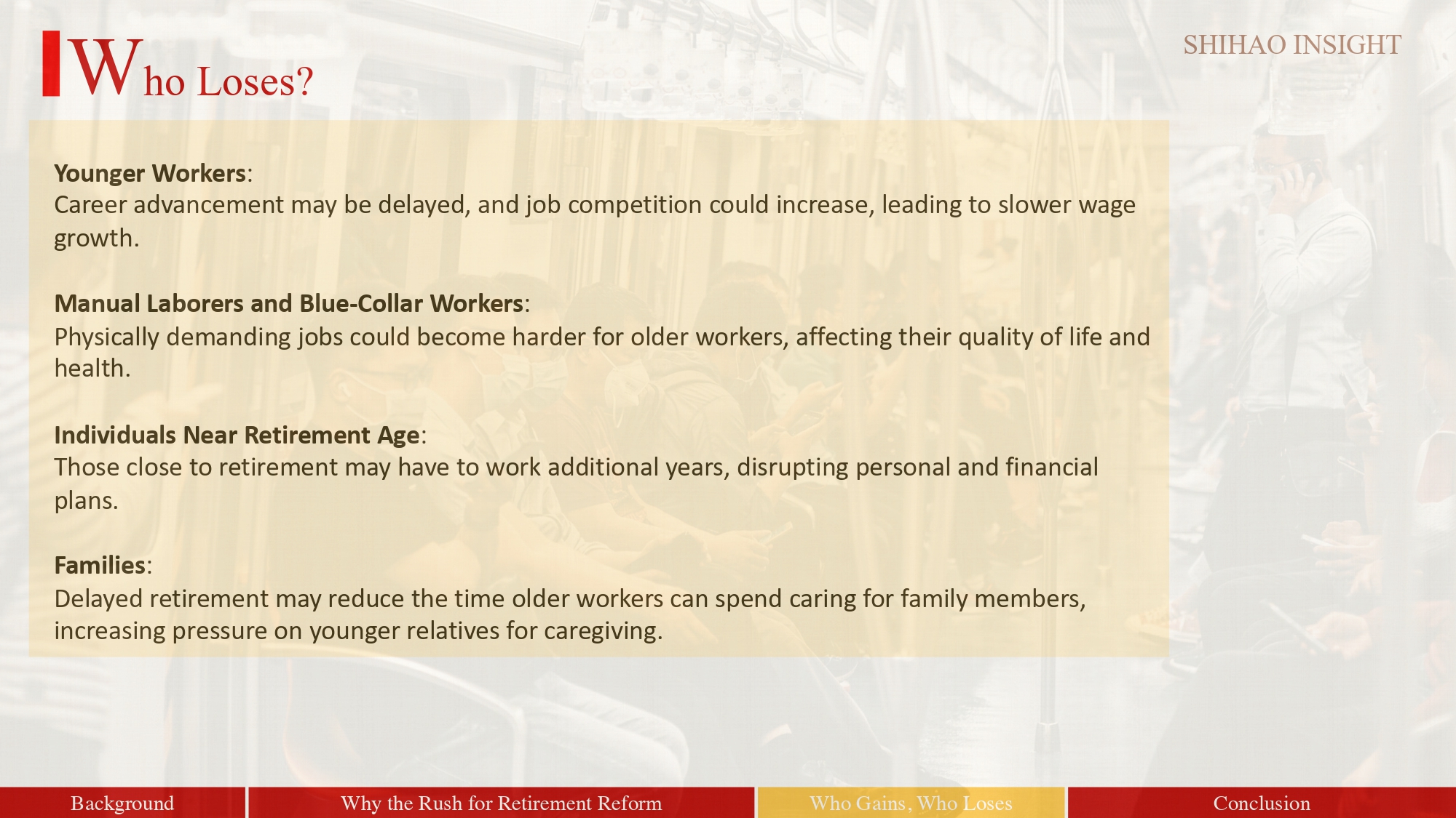 Workers who were planning to retire soon might feel the negative impact of having their retirement delayed by the reform. For example, a worker in their late 50s or early 60s who expected to retire under the current age limit might now have to work additional years, which could disrupt personal and financial plans.