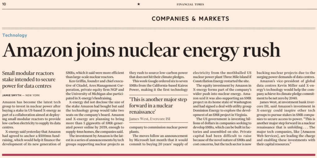 Amazon has taken a significant step by investing in X-energy, a U.S.-based nuclear developer specializing in SMRs. The investment is part of a $500 million fundraising effort to develop and license advanced SMR technology. Amazon plans to deploy these reactors to power its data centers, aiming to bring more than 5 gigawatts of SMR-generated power online by 2039—enough to supply energy to 4 million homes. This move not only secures a low-carbon energy source for Amazon but also positions the company on X-energy’s board of directors, influencing the future of nuclear technology.
