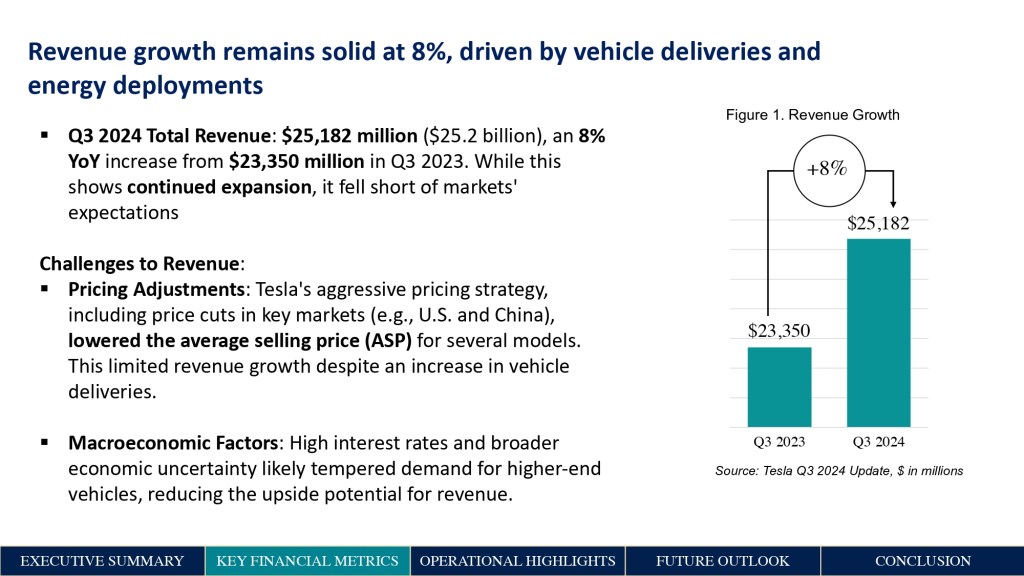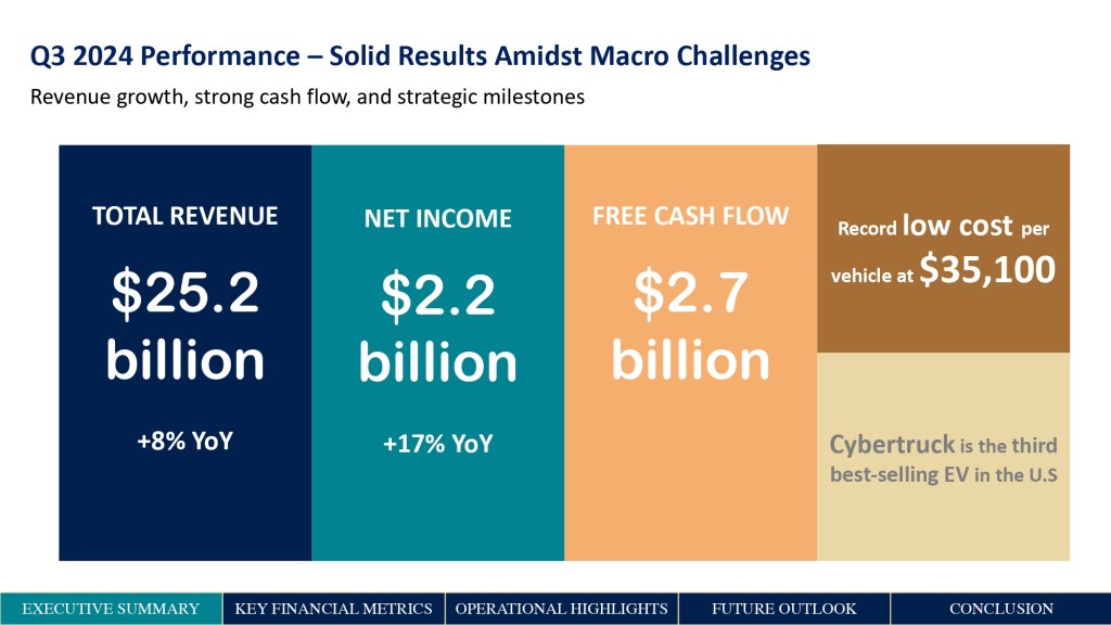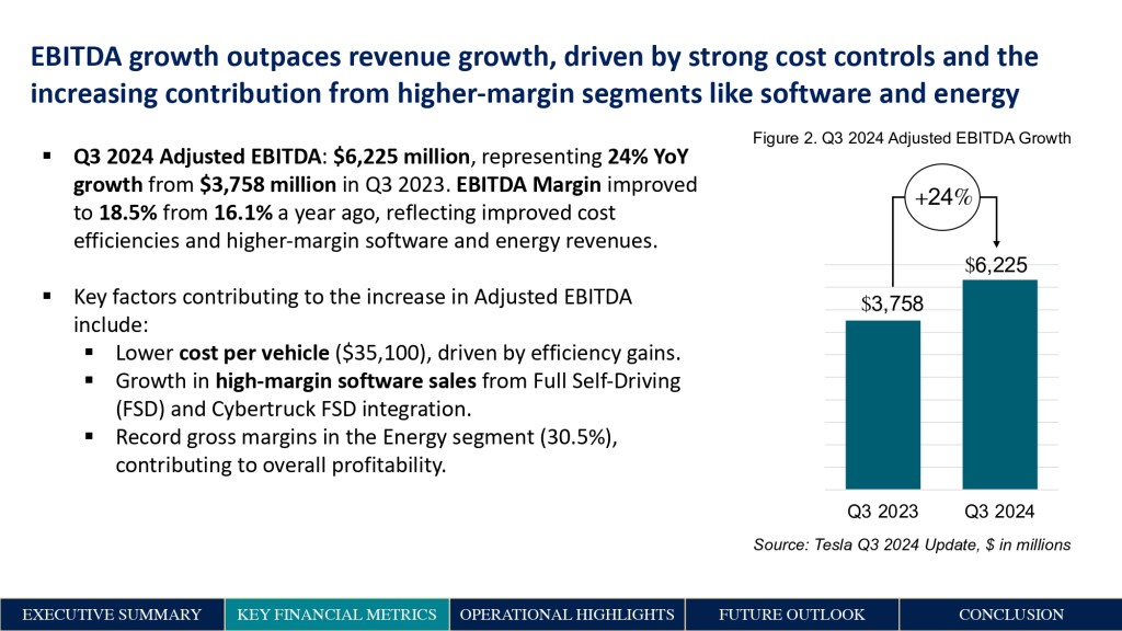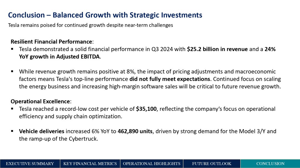 Tesla demonstrated a solid financial performance in Q3 2024 with $25.2 billion in revenue and a 24% YoY growth in Adjusted EBITDA.