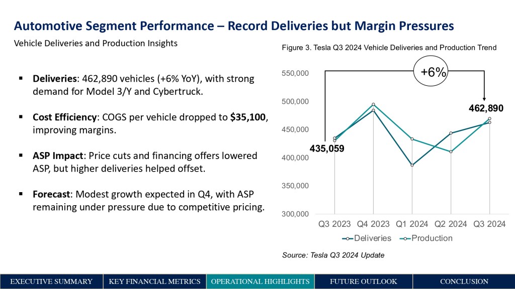 Vehicle deliveries increased 6% YoY to 462,890 units, driven by strong demand for the Model 3/Y and the ramp-up of the Cybertruck.
