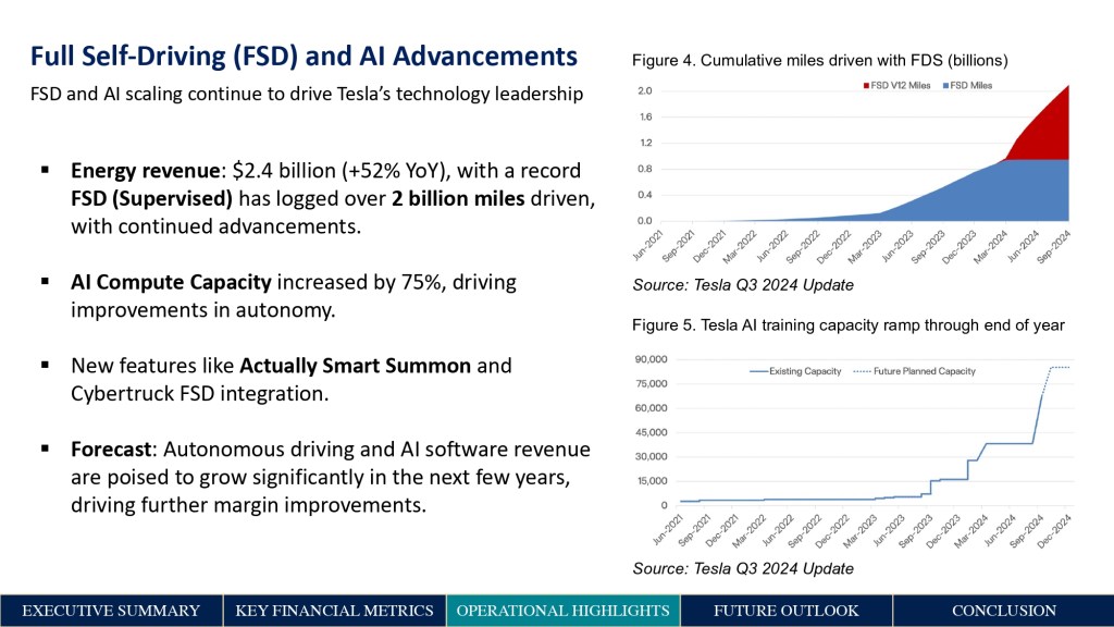 Tesla’s ongoing advancements in AI and Full Self-Driving (FSD), with over 2 billion miles driven and a 75% increase in AI compute capacity, position the company to further monetize its autonomous driving technology.