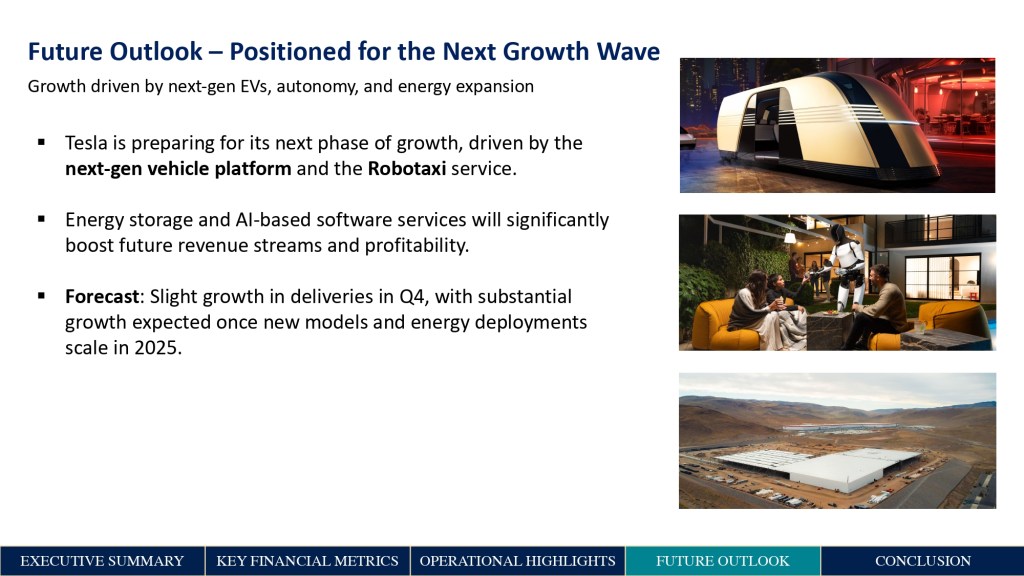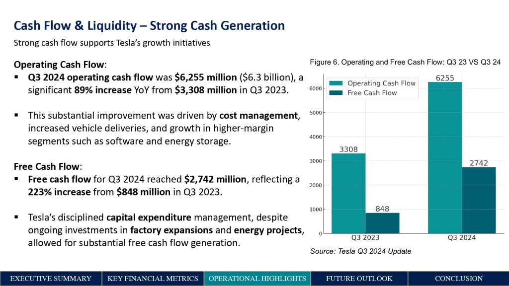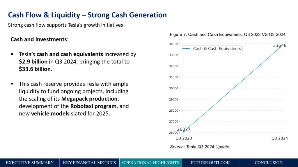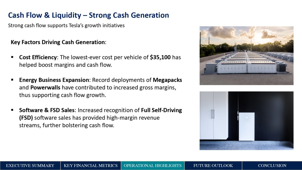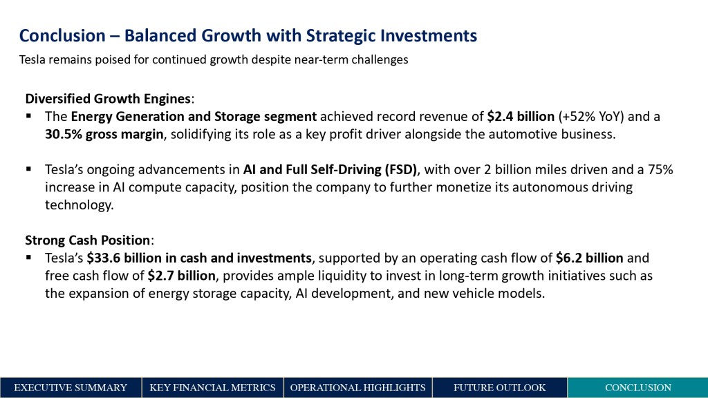 Tesla’s $33.6 billion in cash and investments, supported by an operating cash flow of $6.2 billion and free cash flow of $2.7 billion, provides ample liquidity to invest in long-term growth initiatives such as the expansion of energy storage capacity, AI development, and new vehicle models.